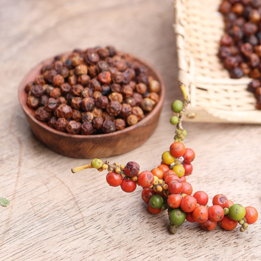 手作業でひとつづつ丁寧に赤い実だけを集め、天日乾燥させたのが完熟赤胡椒です。カンポットペッパーの完熟胡椒は、黒胡椒よりもマイルドな辛さで香りが強いのが特徴。肉類や胡椒を効かせたいお料理、お皿を華やかに魅せたいときに使うのがおすすめです。