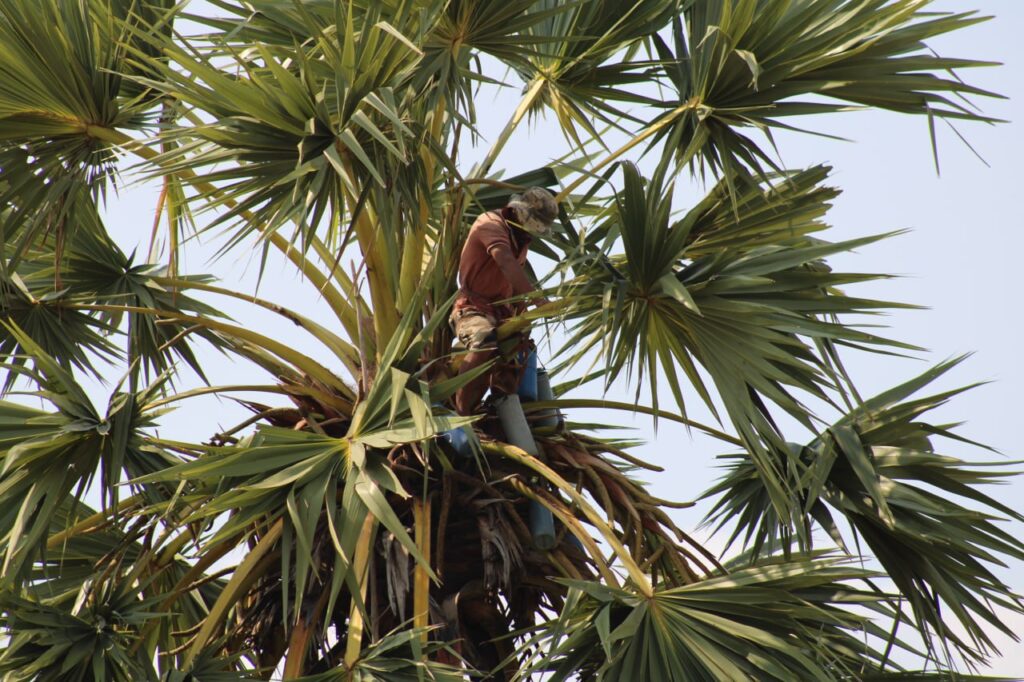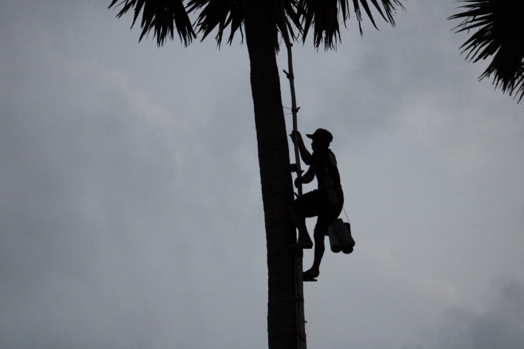 毎年12月~5月の収穫期に家族が所有するヤシの木に自家製のはしごで登ります。専用のナイフで花序に傷をつけ、竹筒で蜜を採取します。