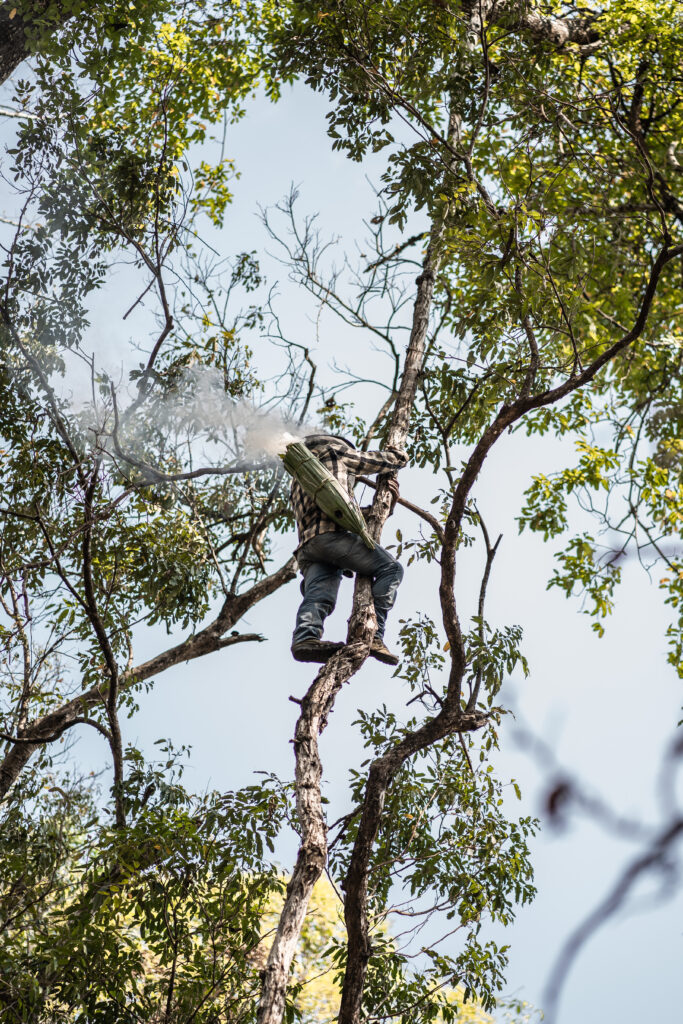 火を越しにつけながら、ハチの巣をめがけて高い木をのぼっていきます。