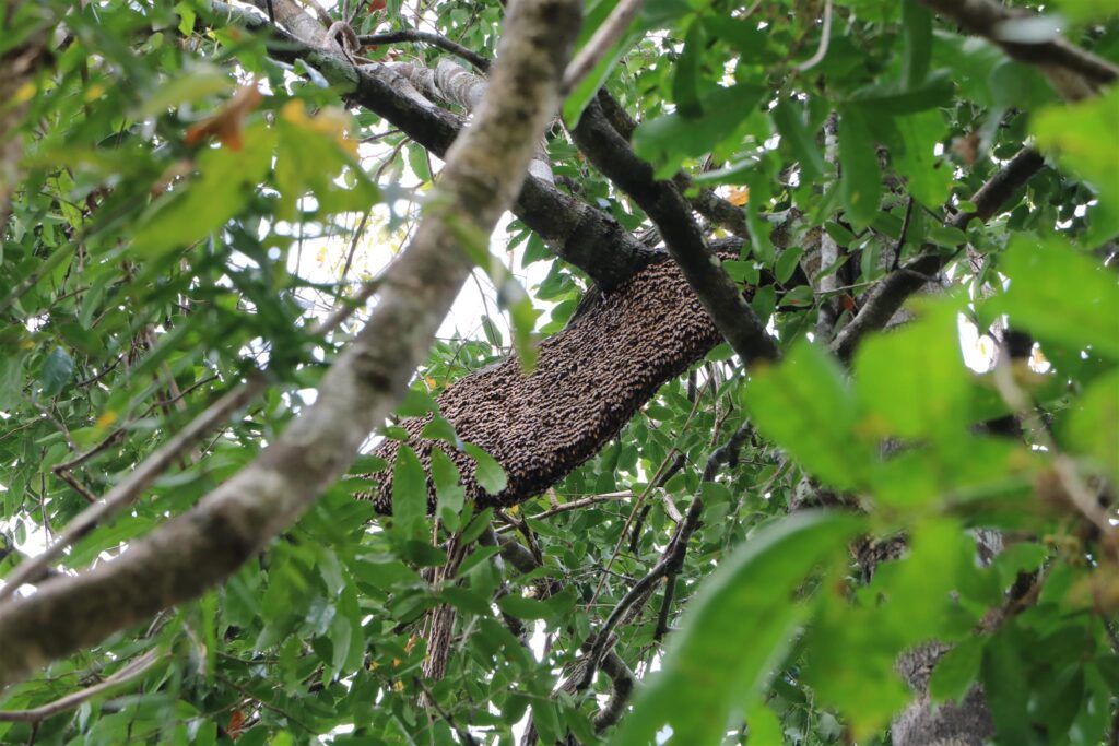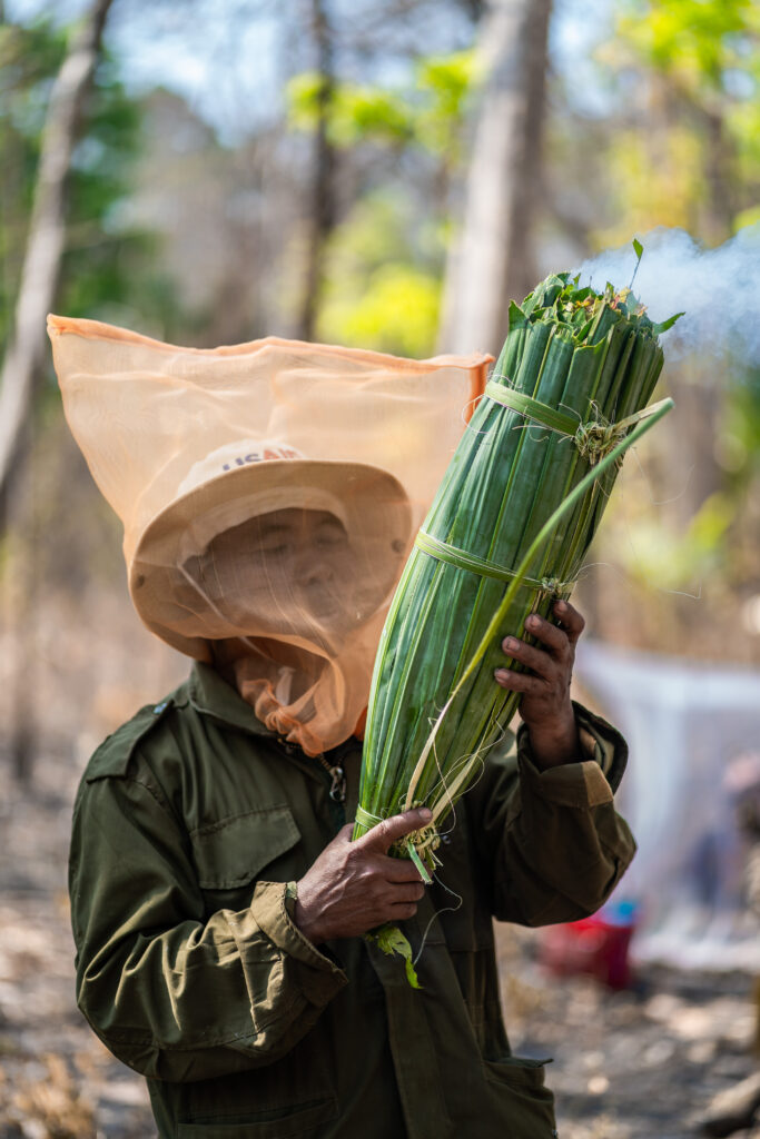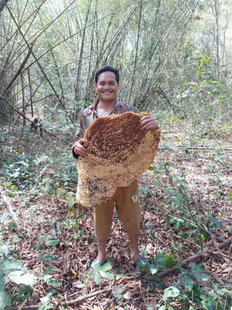モンドルキリの密林に入り野生の大ミツバチ(Big bee)の巣から採取したハチミツは、フローラルな香りと濃い黄金色をしています。養蜂のミツバチ(Small bee)の蜜とは比べ物にならないくらい美味しいと現地の人は言います。
